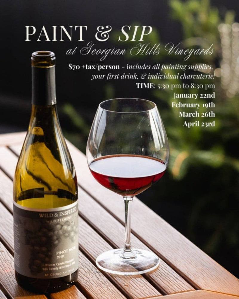 Sip, paint, & create unforgettable memories! Hosted by Tyler Boyle and Heather Smith Parry at Georgian Hills Vineyards' **NEW** Winter Wine Bar!